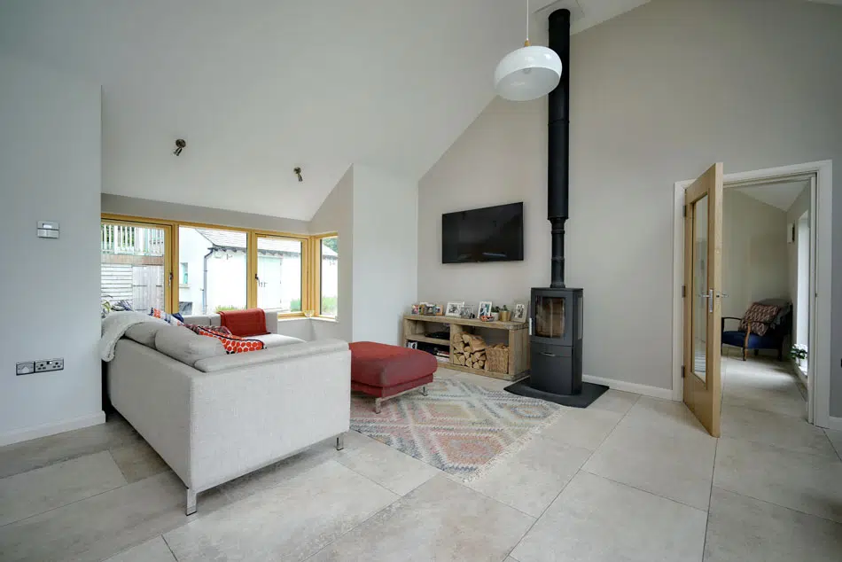 This quaint thatch cottage on the North coast required additional living space to make it a more functional home. The entrance was relocated to the side of the property within a new thatched roof addition, leading to a separate and spacious open plan living/kitchen/dining extension to the rear. Externally, the extension was finished in white render under a natural slate roof, with galvanised steel rainwater goods.