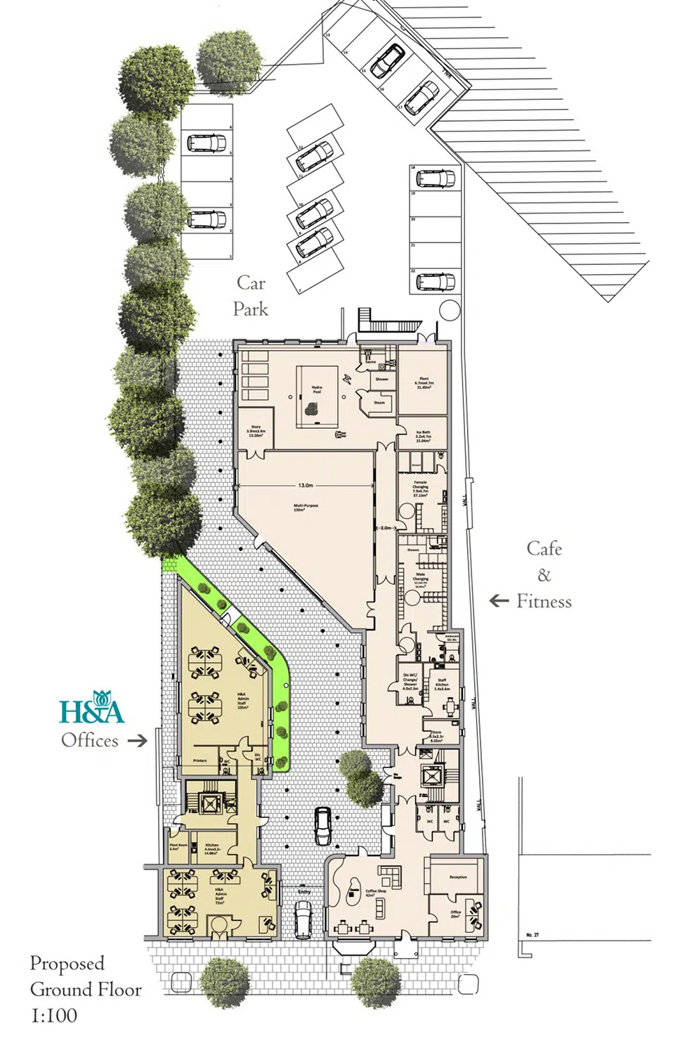 Design and Planning stage drawings for a new fitness and health centre in Draperstown, incorporating a coffee shop, multipurpose hall, gym and studio space. Also included is a number of office units.